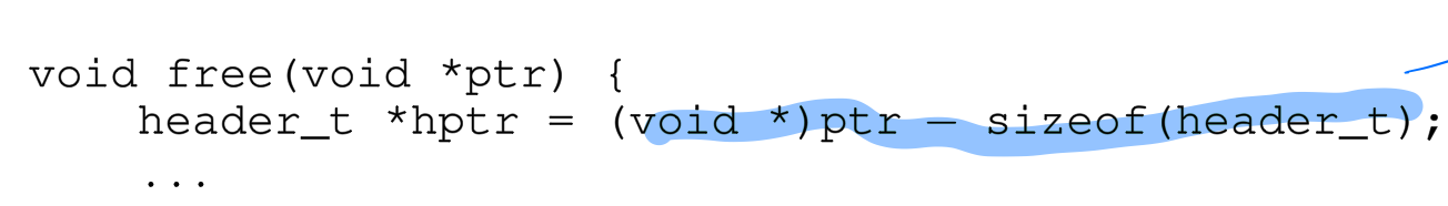 위 그렘에서 현재 ptr의 위치를 즉 자유 공간을 free(ptr)을 이용해 반환하려 한다. 그렇다면 현재 공간의 크기를 알아내야하는데, 헤더에 위치해 있기 때문에 헤더에서 해당 정보를 얻어온다. ptr에서부터 헤더의 접근하는 방법이다.
