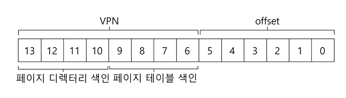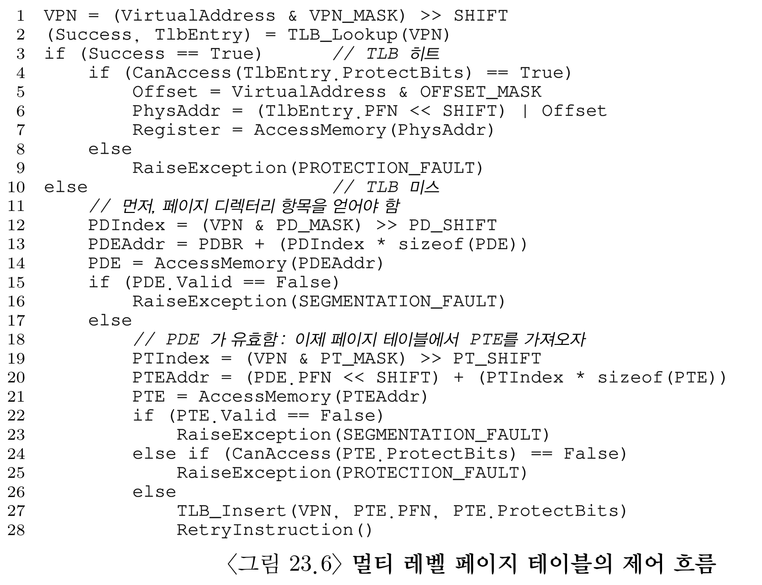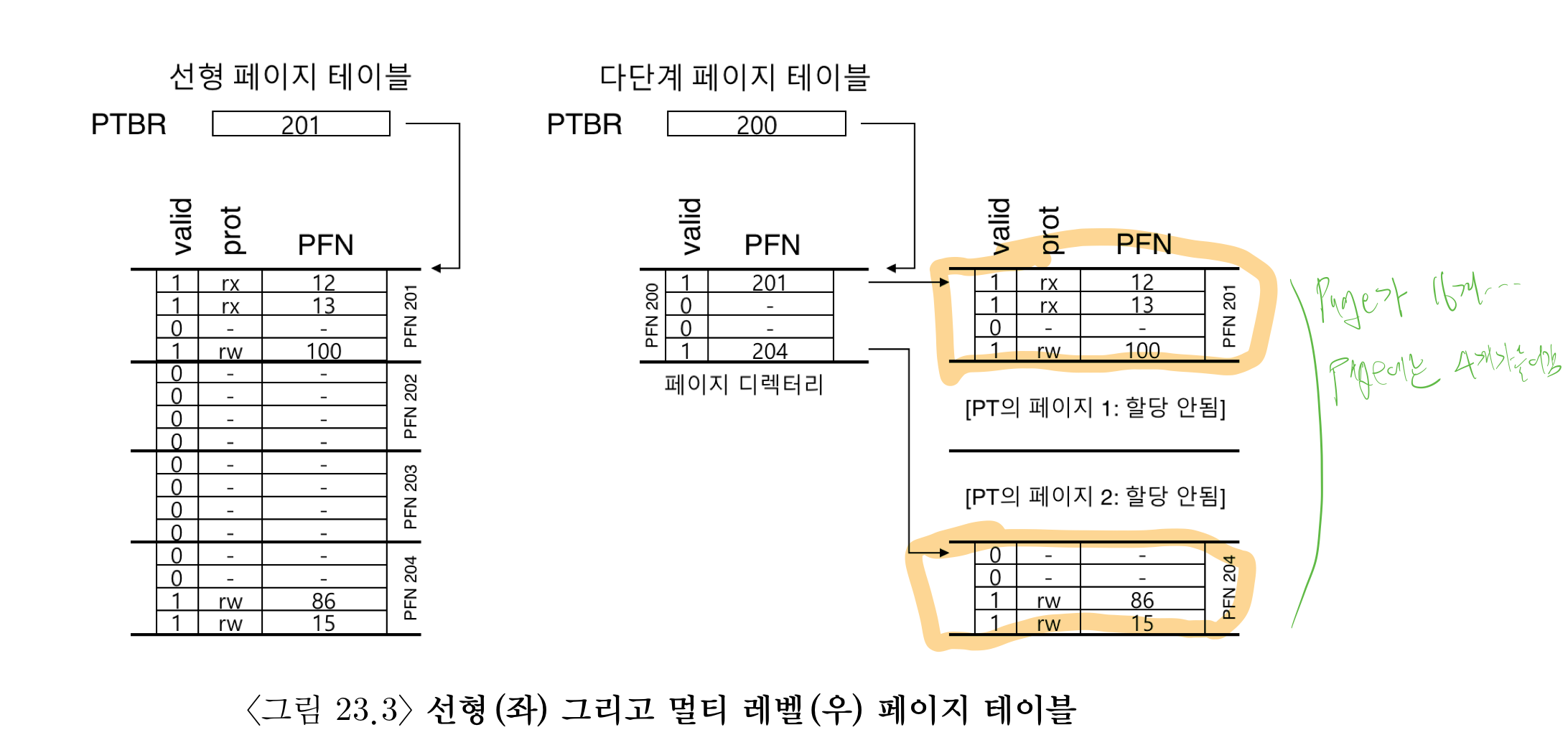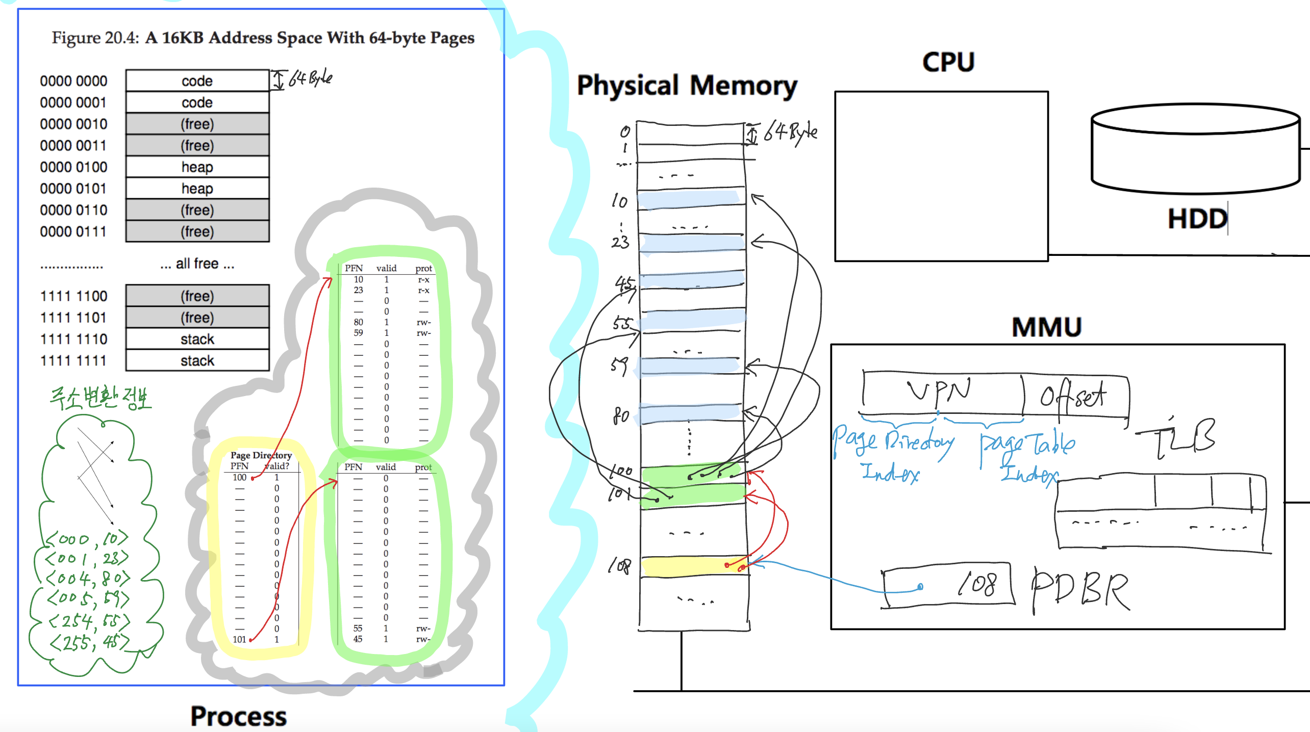 먼저 페이지 테이블을 페이지 크기의 단위로 나눈다. 그다음 페이지가 유효하지 않은 항목만 있으면 해당 페이지는 할당하지 않는다여기서 페이지의 갯수가 줄어든다). 페이지 디렉토리라는 자료구조를 새롭게 만들고, 그 페이지 디렉토리안에는 PDE(page directory entries)페이지테이블들의 PFN위치가 있다. 그렇게 접근하여 얻어낸 페이지테이블에서 PTE를 뽑아내고, 그 PTE에서 PFN을 뽑고, offset과 결합하여 실제 물리주소를 얻어낸다. 당연하게도 PTBR이라는 곳에서는 Page Directory의 위치를 알고 있어야 한다. 프로세스간 이동이 일어난다면 이 값 또한 초기화 해줘야 한다.