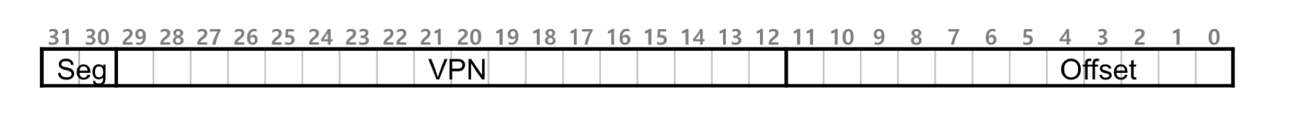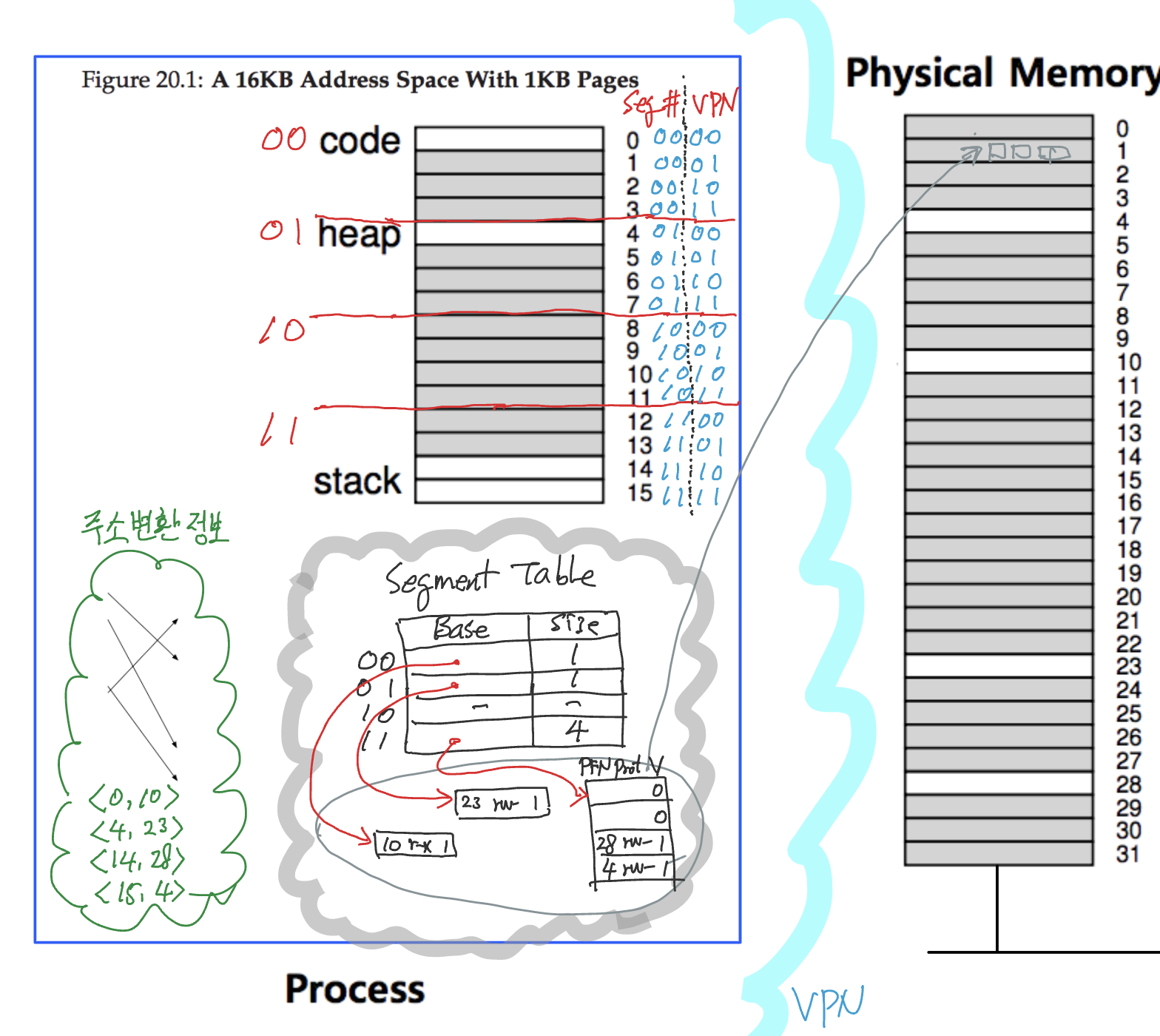 그렇다면 다시 가상주소공간의 표현을 위처럼 할 수 있을 것이다. VPN을 다시 Seg로 나누었다. 총 4개의 세그멘트로 나누었다. 00, 01, 10, 11이 세그멘테이션을 표현 할 수 있는데, 00에는 미사용 공간, 01 코드, 10 힙, 11은 스택 으로 구성시킨다. 이제 미사용을 제외한 3개의 세그멘테이션을 사용할 수 있고, 그 세그멘테이션에 대한 base-bound 레지스터쌍이 생성된다. 그리고 해당 base로 이동하게 되면 페이지 테이블이 들어있다. 미사용 공간에 대해서 페이지테이블을 생성하지 않고, 세그멘트의 size를 정의했기에 원하는 크기만큼의 페이지 테이블을 사용할 수 있다. 즉 메모리 사용이 개선된다. 더이상 스택과 힙상이의 할당되지 않은 것들이 페이지 테이블 상에서 공간을 차지하지 않는다.