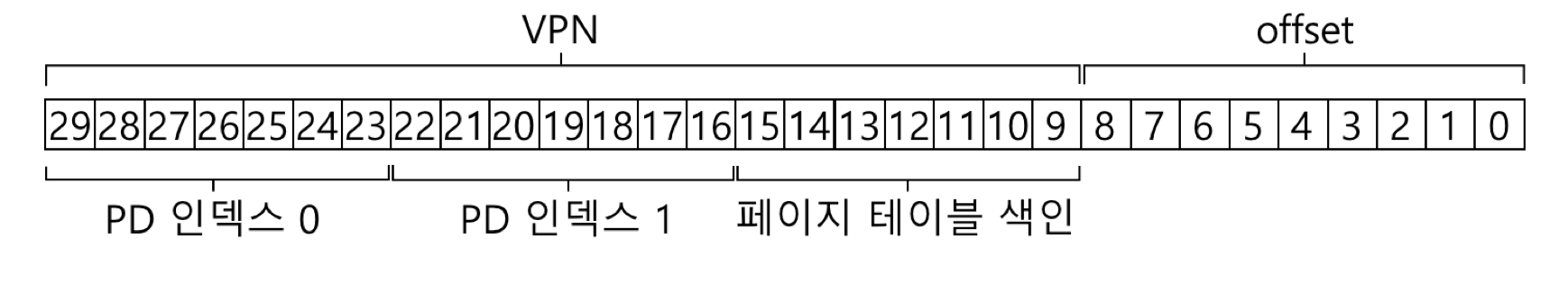 먼저 페이지 테이블을 페이지 크기의 단위로 나눈다. 그다음 페이지가 유효하지 않은 항목만 있으면 해당 페이지는 할당하지 않는다여기서 페이지의 갯수가 줄어든다). 페이지 디렉토리라는 자료구조를 새롭게 만들고, 그 페이지 디렉토리안에는 PDE(page directory entries)페이지테이블들의 PFN위치가 있다. 그렇게 접근하여 얻어낸 페이지테이블에서 PTE를 뽑아내고, 그 PTE에서 PFN을 뽑고, offset과 결합하여 실제 물리주소를 얻어낸다. 당연하게도 PTBR이라는 곳에서는 Page Directory의 위치를 알고 있어야 한다. 프로세스간 이동이 일어난다면 이 값 또한 초기화 해줘야 한다.