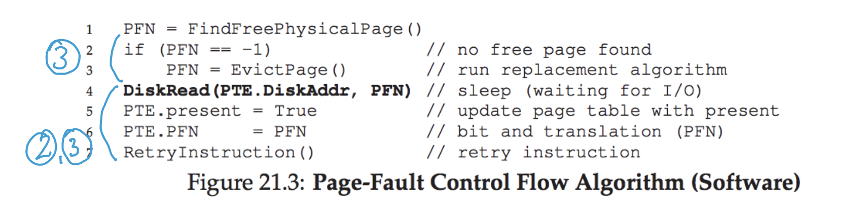 메모리에 스왑을 완료했다면 PTE의 PFN값을 불러온 페이직 탑재된 물리메모리의 PFN의 값으로 변경한다. 그리고 페이지폴트를 발생시킨 명령어(코드)가 재실행된다. 이번에는 TLB미스가 발생하고 TLB미스 처리과정에서 TLB값이 갱신된다. 이를 피하기 위해 페이지 폴트시 함께 TLB에 정보를 저장 시킬 수도 있다.