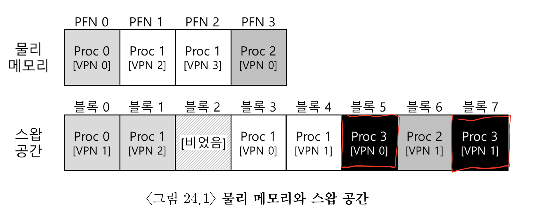 스왑 공간은 결국 시스템이 사용할 수 있는 메모리 페이지의 최대수를 결정하기 때문에 중요하다. 지금은 문제를 단순화 하기 위해 스왑공간은 매우 크다고 가정한다.