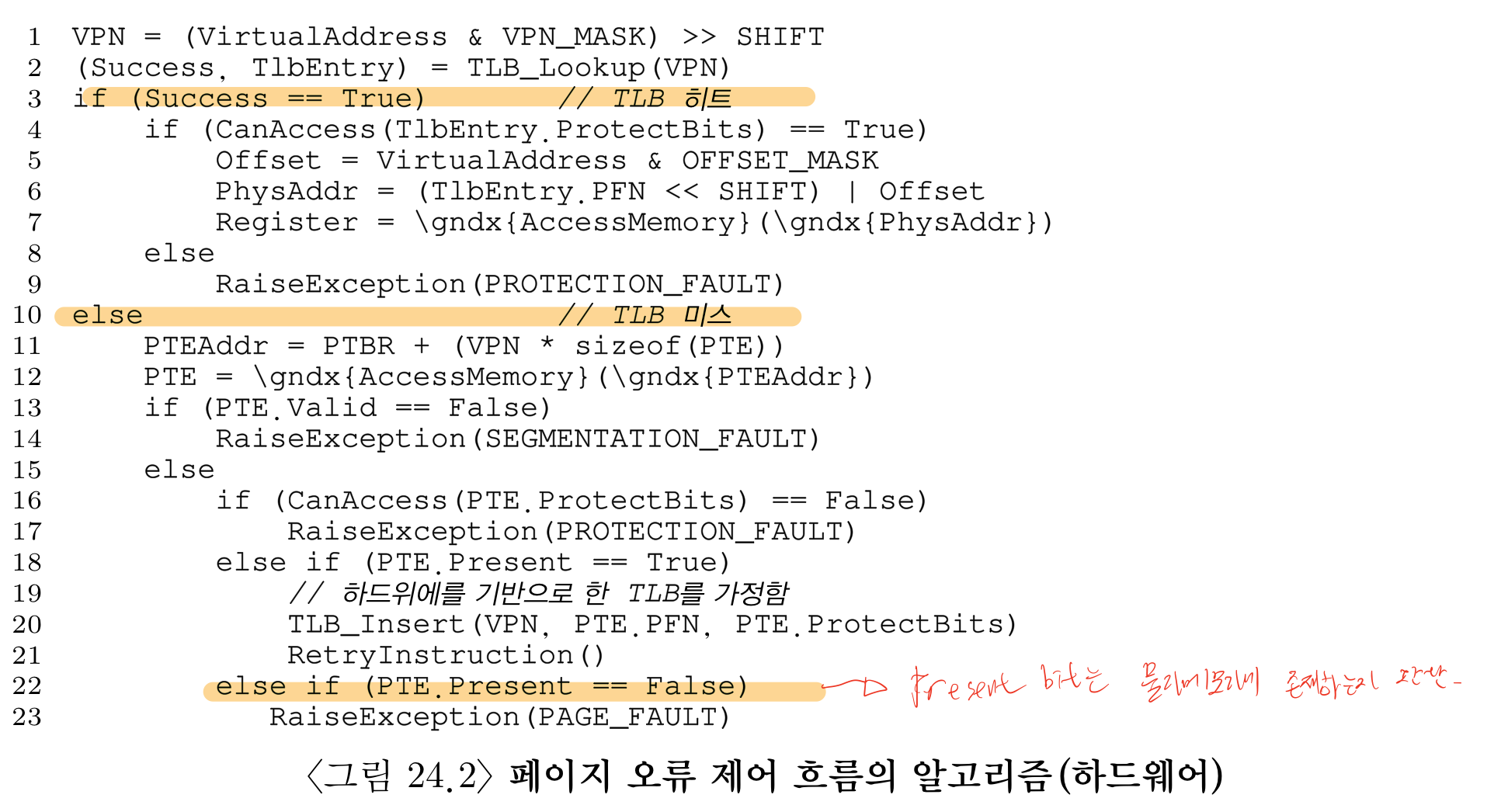 이후 TLB미스가나 다시 해당코드를 재실행하고, TLB에서 주소 변환 정보를 찾게 된다. 물리 주소에 드디어 접근할 수 있게 된다.