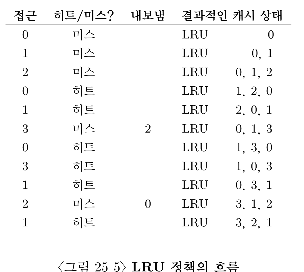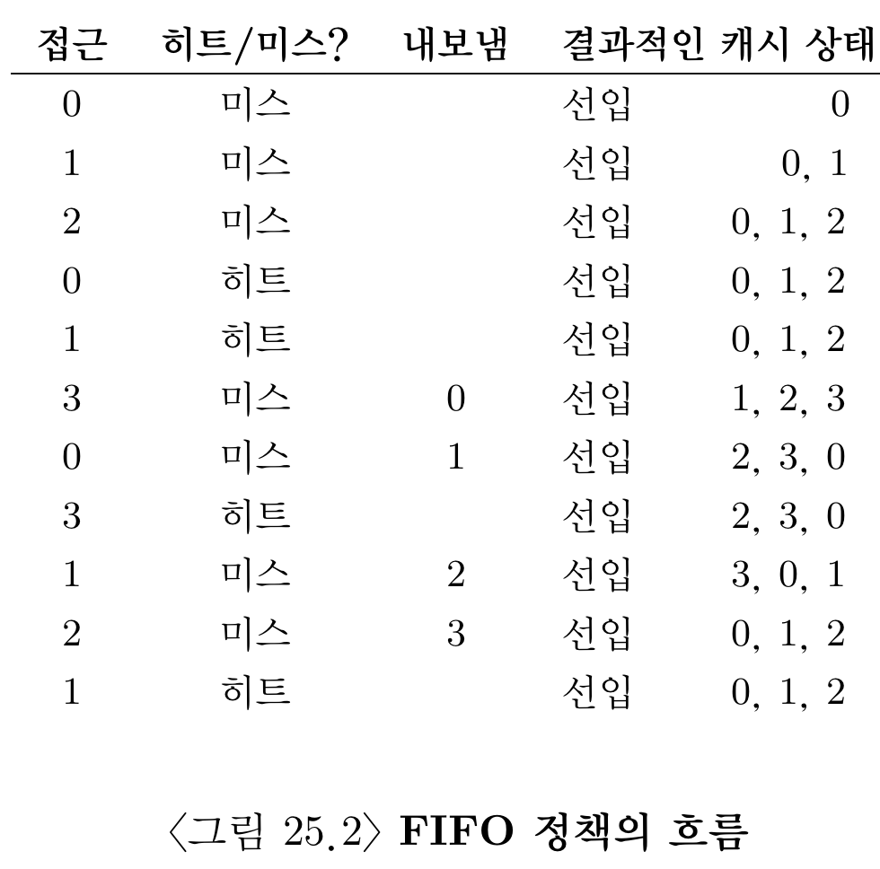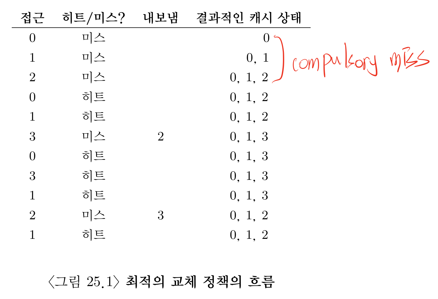 첫 3번은 처음 접근하는 것이기 때문에 당연히 캐싱이 되어 있을 일이 없기 때문에 compulsory miss가 나타난다. cold start라고도 불리는데 이러한 miss는 어떠한 정책을 펼치더라도 일어난다.