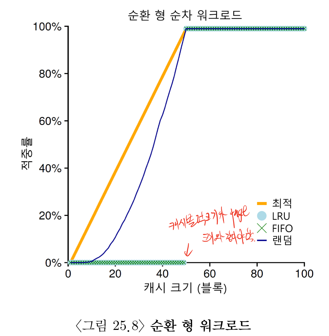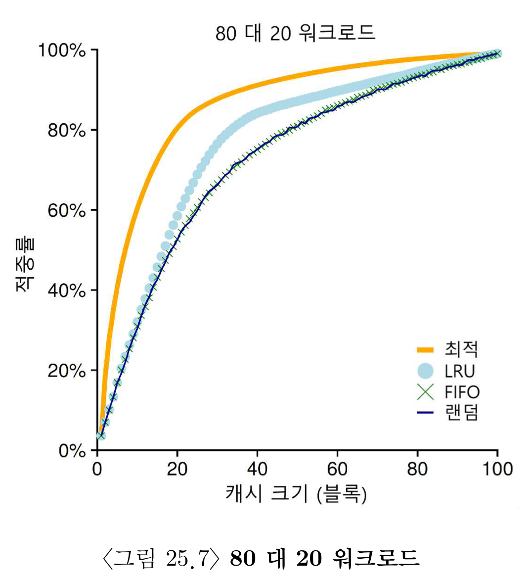 LRU와 FIFO에서 가장 안좋은 성능을 보인다. 순차 반복 워크로드는 가장 오래된 페이지들을 내보낸다. 반복적인 특성 탓에 LRU에서도 이러한 특징을 담아내지 못한다. 그러나 무작위(Random)방식은 기대 이상의 방식을 보여주고 있다.