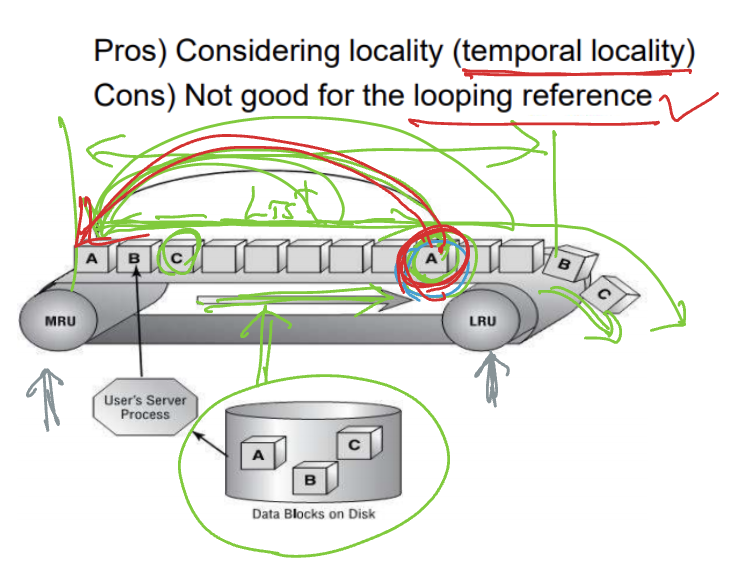 페이지를 메모리와 디스크상에서 관리하면서 많이 쓰이는 페이지를 구별해내는 이 과정 또한 캐싱의 한 과정이라고 볼 수 있다. 캐싱의 모든 목적은 캐싱 된 것을 가장 많이 사용하게 해야한다. 그래야지 성능 향상이 있다. 지금의 문제에서는 디스크에서 가져오는 페이지를 최소화 해야한다. 즉 캐시 히트 횟수를 늘리는 것이다.