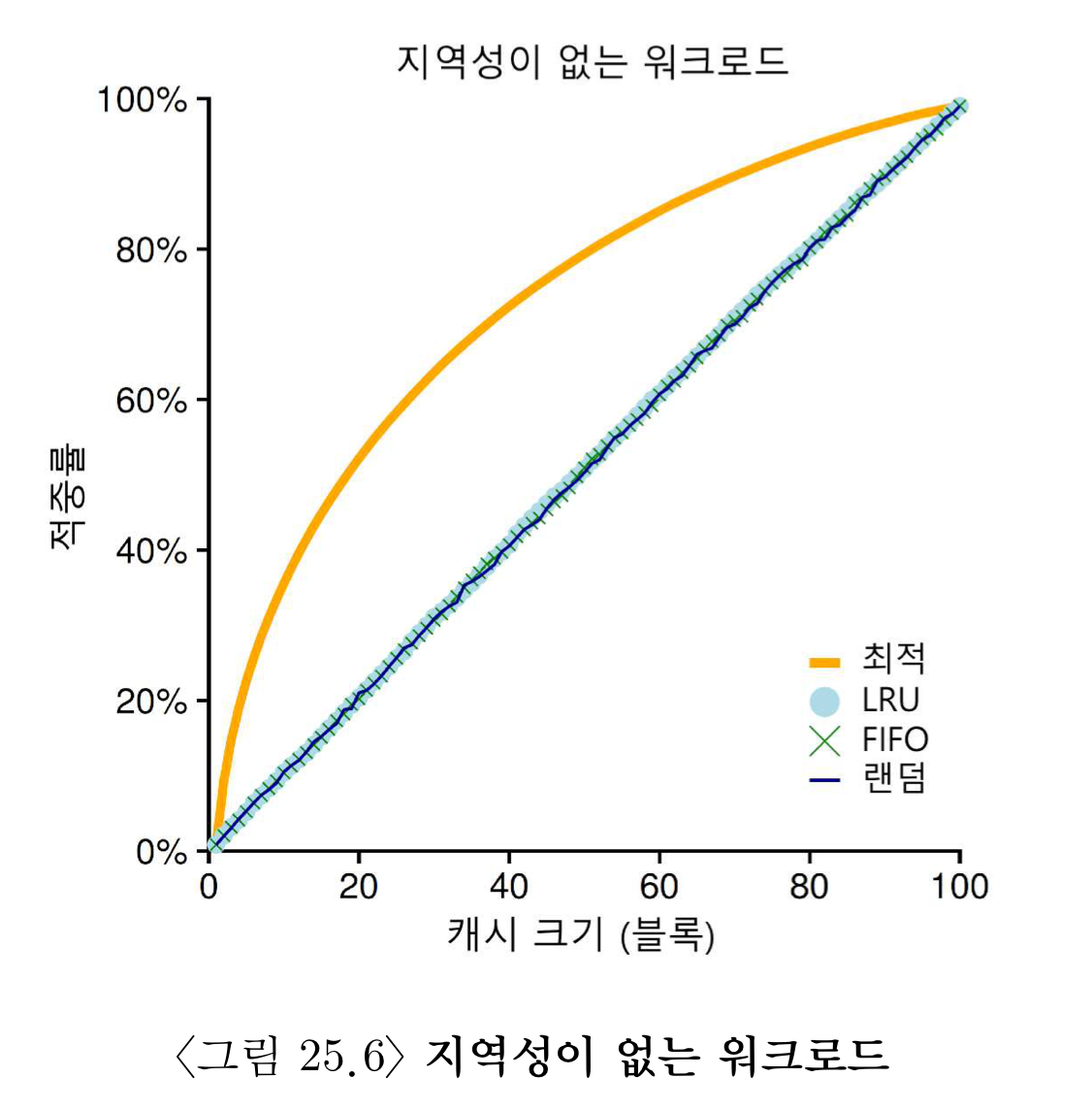 실행하는 코드들에는 어떠한 특성을 띌 것이다. 가장 먼저 무작위로 참조되는 지역성이 없는 워크로드를 살펴보자