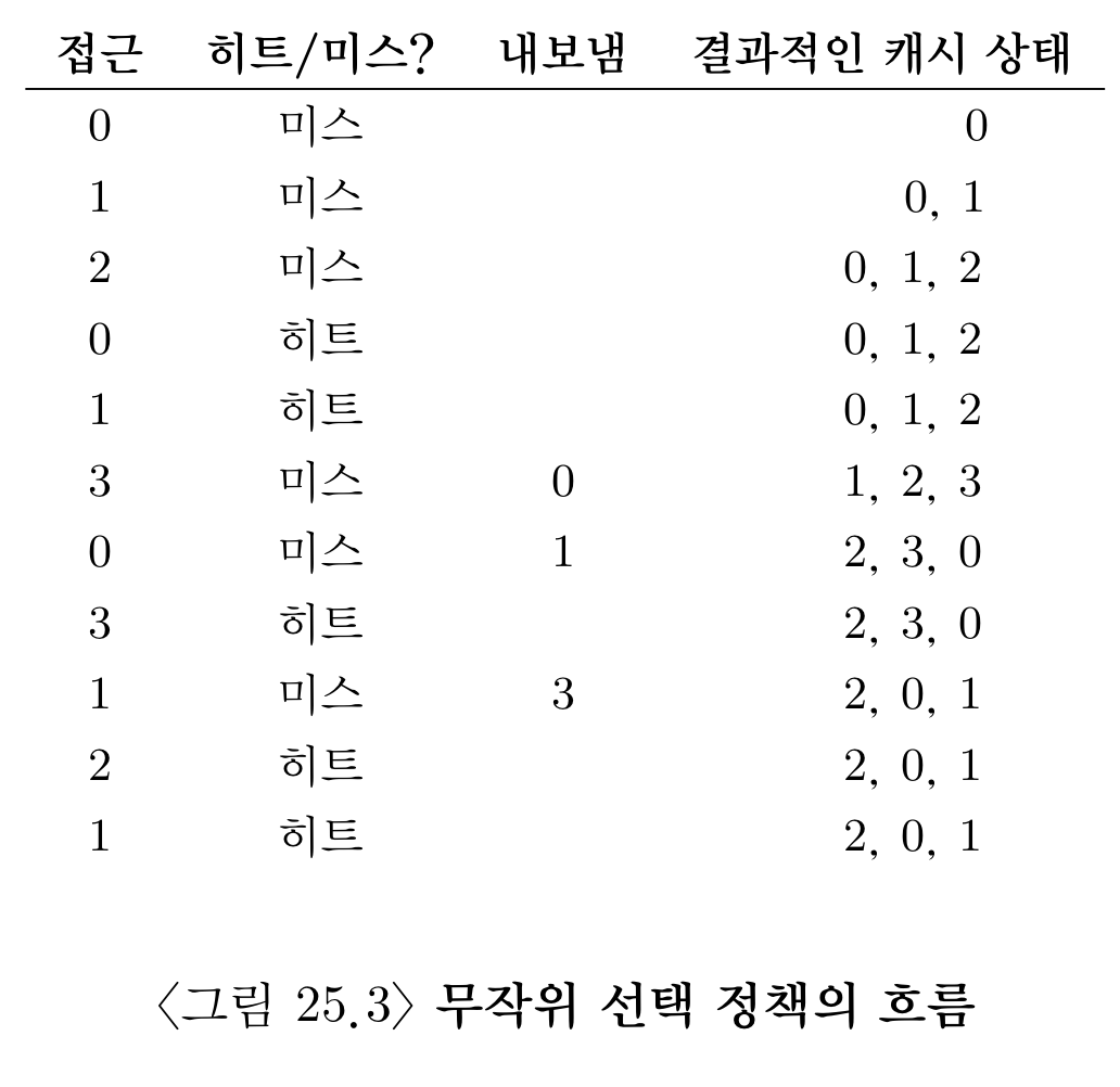 FIFO와 마찬가지로 구현하기 쉬운 성질을 가지고 있다. 대신 운에 의존하는 결과를 낳게 된다. 어떨때는 이상적인 히트비율을 보일수도 있고 어떨때는 최악의 히트비율을 보일 수도 있다.