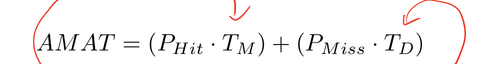 이 hit/miss 횟수를 안다면 평균 메모리 접근 시간(average memory access time, AMAT)을 계산 할 수 있다. 그렇게 어려운 수식은 아니다.