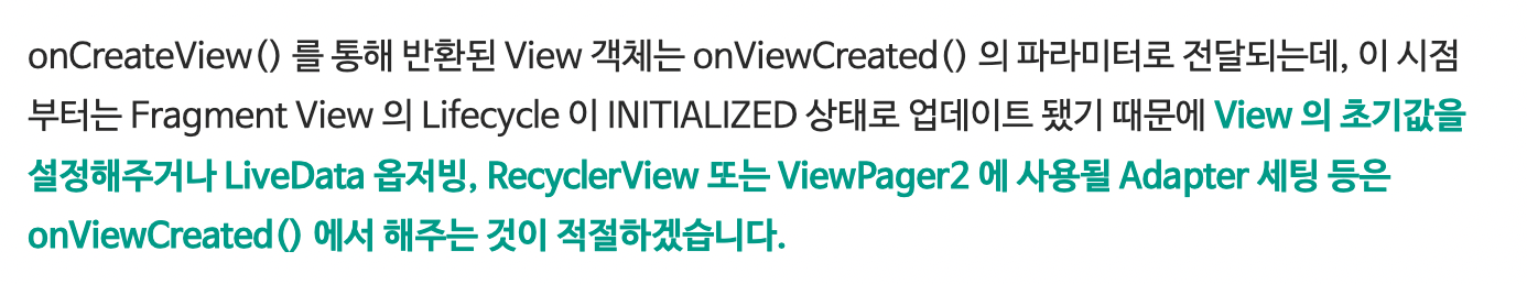 위 메뉴바는 각각의 프래그 먼트와 연결이 돼 있고, 홈 , 채팅, 내 정보를 클릭할때마다, 라이프사이클이 시작되는거를 알 수 있었는데, 처음에는 onDestroyView만 실행되는 줄 알았는데, onDestroyView -> onDestroy 처럼 완전히 프래그먼트를 죽이는 작업까지 한다. 그렇다면 onDestroyView와 onDestroy의 정확한 차이점을 모르겠다. 왜 onCreate에서 코드를 작성하지 않고, onViewCreate에서 시작하는지 정확히 이해가 되지 않는다. 그래서 간단하게 찾아 봤는데,
