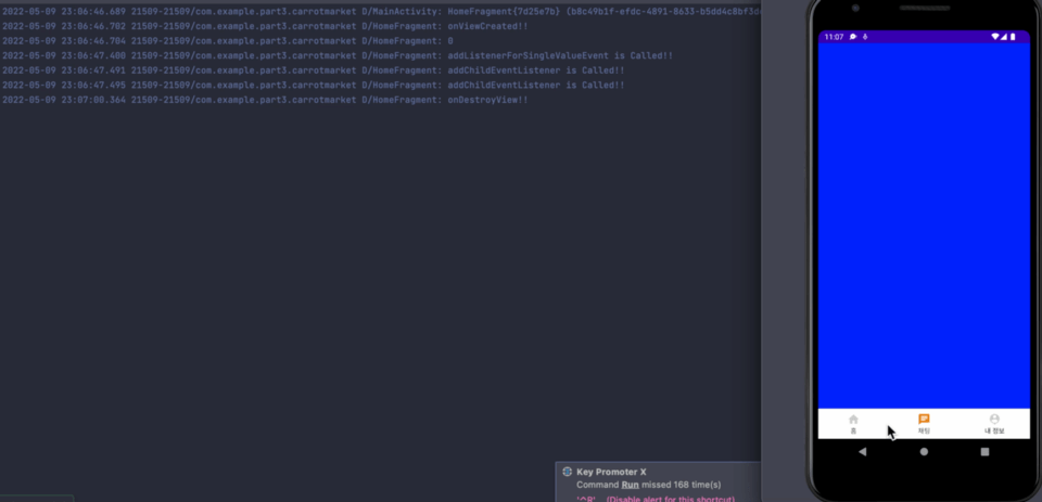 지금까지 해왔던 것과 똑같다는 생가이 들 수 있지만, 액티비티가 아니라 프래그먼트를 이용하게 된다는 점에서 프래그먼트가 가지는 라이프사이클 때문에 리스너를 따로 분리시켜주고, onDestroyedView가 실행될때 해당 리스너를 지워줌으로써, 계속해서 똑같은 프래그 먼트가 중첩되는 현상을 없애야 한다. 이렇게 하게 됨으로써 코드를 분리시켰고, 결과적으로는 동기처리에서 문제가 생겼다. 리스너 두개를 달아서 해결했는데, 그 해결책은 맨 밑 에러란에다가 적어두었다.