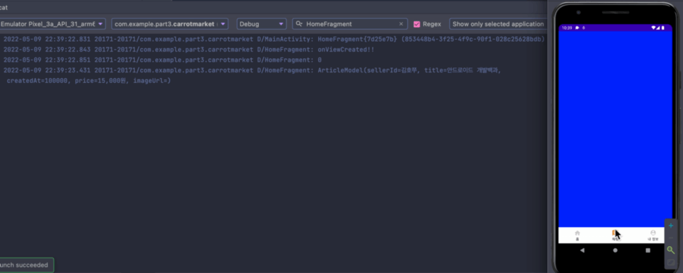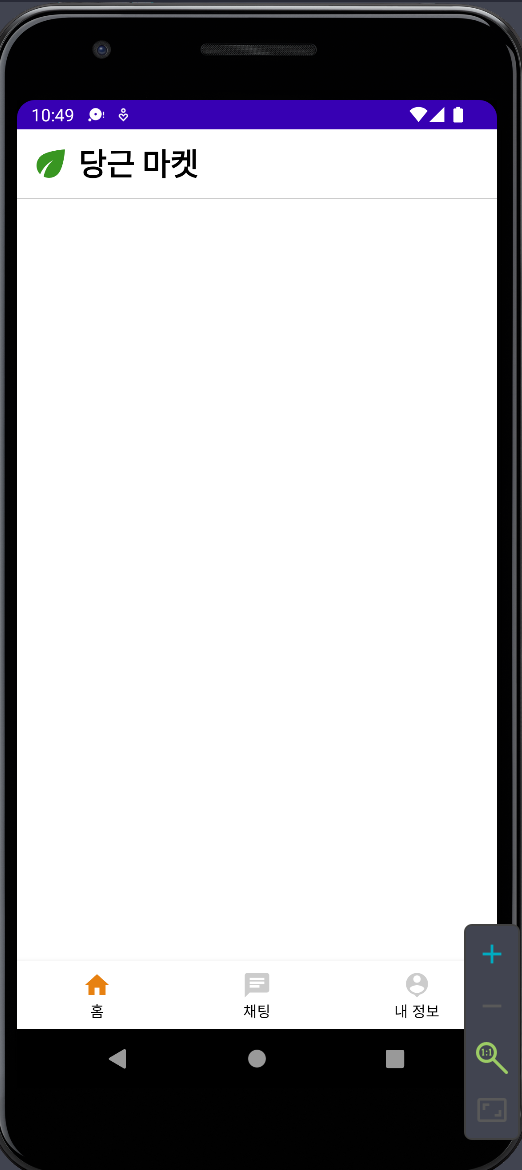 [안드로이드&코틀린] 중고거래앱 만들기#1, 프래그먼트 이용하여 하단메뉴바 만들기, setOnItemSelect # 결과물 미리보기 지금 까지는 액티비티만을 사용하여 화면을 구성했지만, 프래그먼트를 이