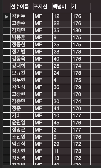 이번에는 LIKE 연산자를 사용하여 특정 성을 가진 선수들을 찾아보자